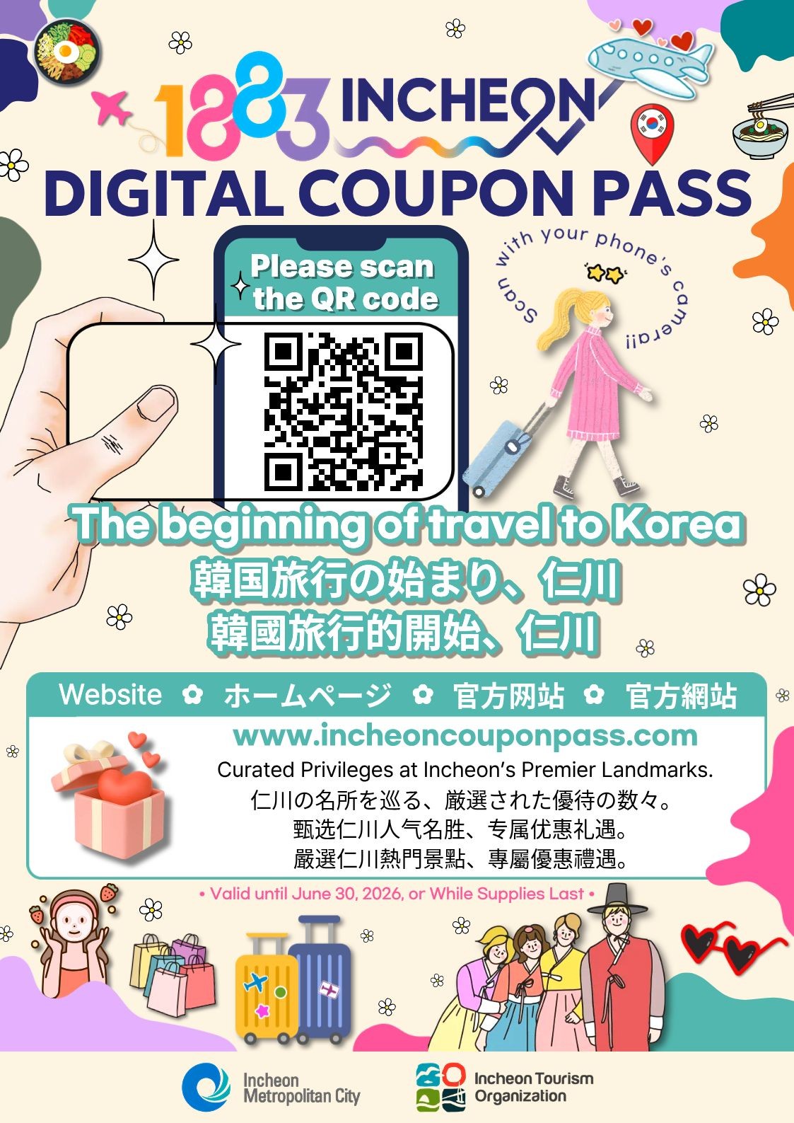 旅の真髄であり、活気あふれる玄関口である仁川(インチョン)へようこそ。 あなたの旅をより特別なものにするために、2025-2026「1883 仁川デジタルクーポンパス」をご活用ください。これは単なる割引プログラムではありません。あなたの「韓国旅行」のポテンシャルを最大限に引き出すための、デジタルキーです。