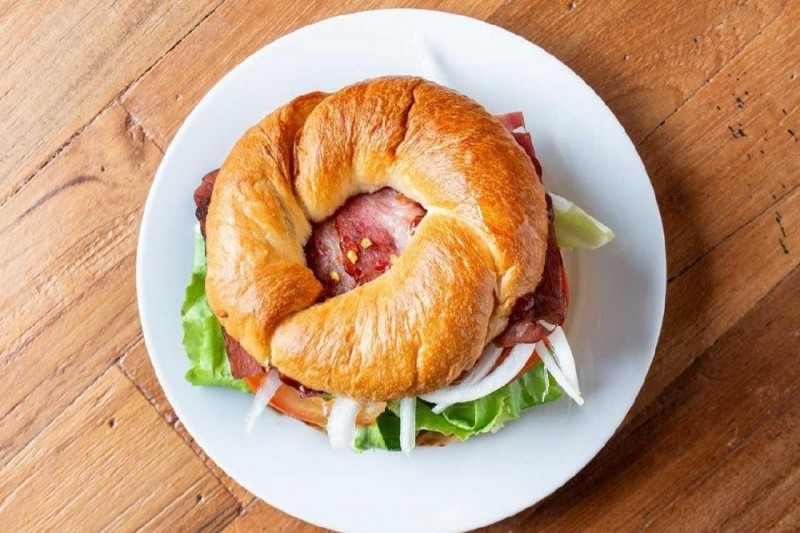 - 香ばしくスパイシーな味わい。特製ベーコンソースを塗ったベーグルに、焼きベーコン、ロメインレタス、トマト、玉ねぎ、レッドペッパーを贅沢にサンドしました。
