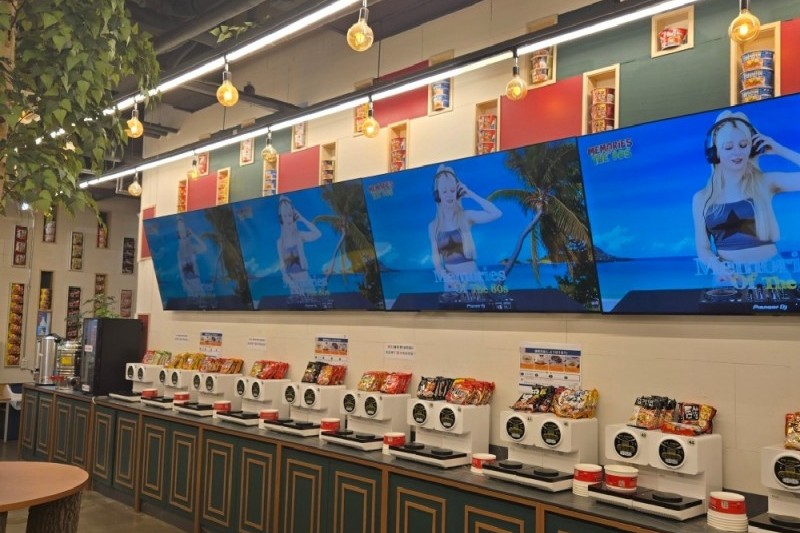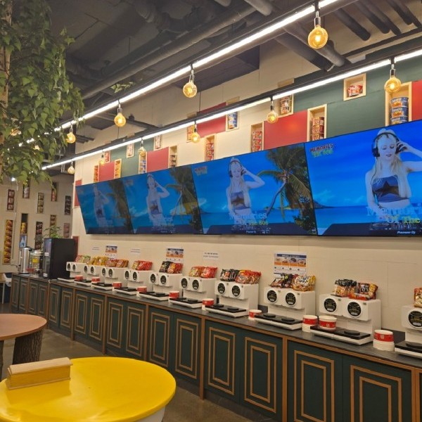 K-ラミョンスタジオの扉を開けると、従来のセルフ食堂の概念は完全に覆されます。そこには、まるで現代アートの美術館のように明るく、隅々まで磨き上げられたスタイリッシュな空間が広がっています。